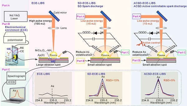 圖:電化學(xué)-LIBS設(shè)備,火花放電-電化學(xué)-LIBS設(shè)備和主動(dòng)可控火花放電-電化學(xué)-LIBS設(shè)備檢測(cè)As(III)的示意圖