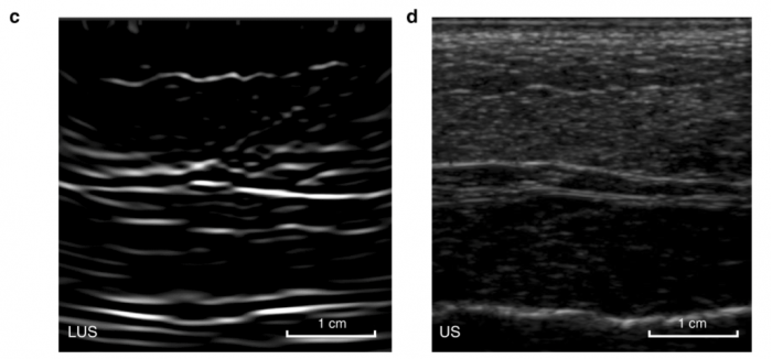 研究人員使用一種激光裝置測(cè)試了這個(gè)想法,該裝置使用一個(gè)波長(zhǎng)為1,550納米的脈沖激光來產(chǎn)生聲波,并使用第二個(gè)連續(xù)激光調(diào)諧到相同的波長(zhǎng)以遠(yuǎn)程檢測(cè)反射的聲波。第二個(gè)激光器是靈敏的運(yùn)動(dòng)檢測(cè)器,可測(cè)量聲波從肌肉,脂肪和其他組織反射回來而引起的皮膚表面振動(dòng)。反射的聲波產(chǎn)生的皮膚表面運(yùn)動(dòng)會(huì)引起激光頻率的變化,可以測(cè)量出該變化。通過機(jī)械掃描人體上的激光,科學(xué)家可以獲取不同位置的數(shù)據(jù)并生成該區(qū)域的圖像。