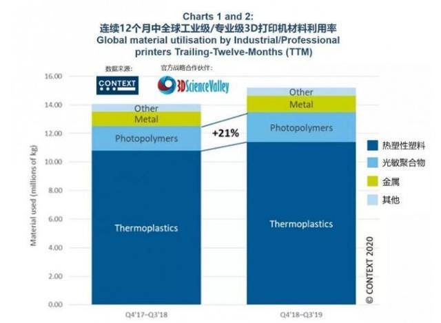 根據(jù)3D科學(xué)谷戰(zhàn)略合作伙伴Context的研究,在過去連續(xù)12個月(2018 第四季度-2019年第三季度)中,工業(yè)級/專業(yè)級3D打印機使用的塑料3D打印材料利用率增長了8%。