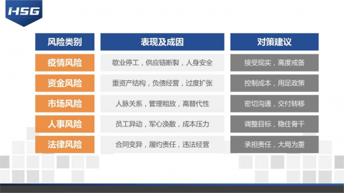 以企業(yè)的經(jīng)營來說,受疫情的影響,企業(yè)因種種不可抗力因素,無法按既定的時間和計劃復(fù)工復(fù)產(chǎn),那么就不可避免的會遭受各種各樣的風(fēng)險。比如一法律風(fēng)險,對于疫情期間可能出現(xiàn)的合同變異、無法按時履約等法律風(fēng)險,蘇總提出企業(yè)應(yīng)主動承擔(dān)相應(yīng)的責(zé)任,以大局為重;二對于人事方面的風(fēng)險,企業(yè)要及時調(diào)整目標(biāo),穩(wěn)住骨干力量;三對于市場方面如人脈關(guān)系、粗放式管理、高替代性等風(fēng)險,企業(yè)要與客戶和合作伙伴進行密切溝通,穩(wěn)固好客戶關(guān)系,并做好風(fēng)險和產(chǎn)品的交付轉(zhuǎn)移;四對資金方面的風(fēng)險,企業(yè)應(yīng)控制好成本并利用好相關(guān)的地方、行業(yè)幫扶政策,度過難關(guān);五對于疫情所帶來的歇業(yè)停工、供應(yīng)鏈斷裂等風(fēng)險,企業(yè)必須高度戒備,切勿盲目復(fù)工,以致發(fā)生不可挽回的風(fēng)險。