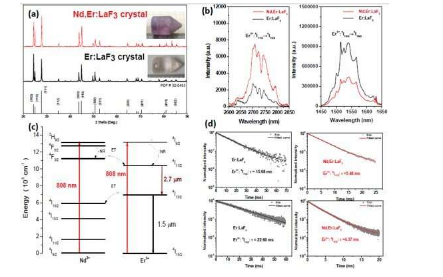 在他們的實驗中,首次通過Bridgman方法成功生長了Nd,Er:LaF 3晶體。還生長了Er:LaF 3晶體用于比較。它保持沒有第二相的六方晶體結(jié)構(gòu)。Nd 3+和Er 3+的偏析系數(shù)分別為0.96和0.76,表明很容易將Nd 3+和Er 3+離子摻雜到LaF 3基質(zhì)中。