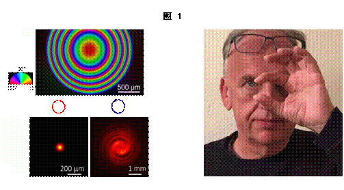 (圖左)平面透鏡的雙折射圖像以及具有不同手性圓偏振性質的488nm波段激光的光強分布模式。焦距為±208nm;