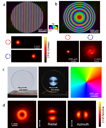 圖片展示了用低損耗雙折射修飾方法制作的幾何相位光學元件及矢量光束轉換器。a)慢軸梯度為0.01π?rad?μm^(-1)的幾何相位棱鏡的雙折射圖像(上)以及具有不同圓偏振的工作波長為457nm的CW激光束經過幾何相位棱鏡衍射之后形成的光強分布模式(下)。b)幾何相位透鏡的雙折射圖像,以及具體不同圓偏振的工作波長為488nm的CW激光束經過幾何相位透鏡聚焦和散焦之后的光強分布模式。對于488nm的波長的光,透鏡的焦距為±208mm。c)在線偏振白光照射下的不帶偏振器(左)和帶有偏振器(中)的10毫米矢量光束轉換器。轉換器中心部分的慢軸分布如最右圖所示。d)經過不帶偏振器的轉換器之后的343nm波長的激光束的光強分布模式(左)。由帶有偏振器的轉換器產生的徑向矢量光束(中)與方位矢量光束(右)的光強分布模式。