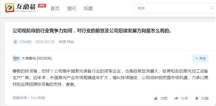 另外,亦有投資者對大族激光現(xiàn)階段競爭力提出疑問。大族激光董秘回復表示,公司是中國激光裝備行業(yè)的領軍企業(yè),也是目前亞洲最大、世界知名的激光加工設備生產(chǎn)廠商。近年來,中國激光產(chǎn)業(yè)市場規(guī)模逐年擴大,增長持續(xù)穩(wěn)定,公司將積極把握市場機遇,力爭以更好的業(yè)績回饋投資者的支持。