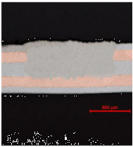 納秒脈沖光纖激光器的峰值功率較高,意味著可以較容易地以很小的平均功率進(jìn)入銅等高反金屬中。使用納秒微焊接工藝作為焊接的一種替代方法,將元件直接貼合在銅印刷電路板(PCB)軌道上的研究顯示出了巨大的前景。目前已經(jīng)成功將厚達(dá)150μm的銅引線貼合到>60μm的沉積軌道上,而與FR4基板之間沒(méi)有任何明顯的分層。這為熱敏元件或工作溫度可能超過(guò)傳統(tǒng)焊接極限的元件的貼合提供了替代方案。
