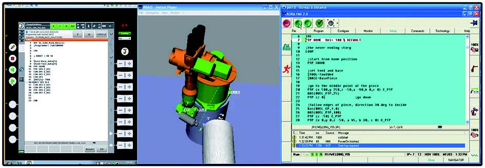 首先打開(kāi)虛擬機(jī) VMWare Work station,在虛擬機(jī)內(nèi)部的虛擬系統(tǒng)環(huán)境下運(yùn)行 KUKA Officelite 軟件。然后查看虛擬機(jī)的 IP 地址,在 SimPro2.2 軟件的 KRC 選項(xiàng)中,修改VRC Host 為虛擬機(jī) 的 IP 地址,Configuration 選擇與實(shí)際設(shè)備一致的 KRC2- KR30HA_3 -FLOOR。點(diǎn)擊左下角 KR30HAAction 欄 下 的 Download RSL 按 鈕, 虛 擬 機(jī) 中 的 KUKAOfficelite 軟件已經(jīng)自動(dòng)運(yùn)行,如圖 5 所示。KUKA Officelite軟件自動(dòng)把離線編程的動(dòng)作編譯成 KRC 機(jī)器人控制器內(nèi)可調(diào)用的程序,儲(chǔ)存在 Program 文件夾下,將兩個(gè)文件拷貝到KRC 控制器中。