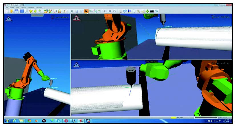 KUKA Officelite 軟件為 KUKA 機(jī)器人離線編程軟件,其作用是將 KUKA 機(jī)器人仿真模擬軟件 KUKA SimPro2.2所設(shè)計(jì)的路徑軌跡程序自動(dòng)編譯成機(jī)械手可執(zhí)行的程序。將 KUKA Officelite 軟件自動(dòng)編譯的執(zhí)行程序拷貝到 KRC 機(jī)器人控制器內(nèi)即可調(diào)用該程序進(jìn)行實(shí)際加工。該軟件可以安裝在 VMWare Work station 虛擬機(jī)內(nèi),因此在主機(jī)內(nèi)安裝VMWare Workstation 虛擬機(jī)后,即可在此虛擬機(jī)內(nèi)部的虛擬系統(tǒng)環(huán)境下運(yùn)行 KUKA Officelite 軟件。