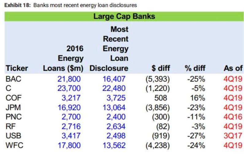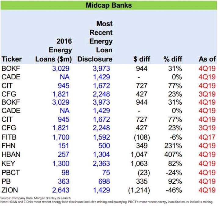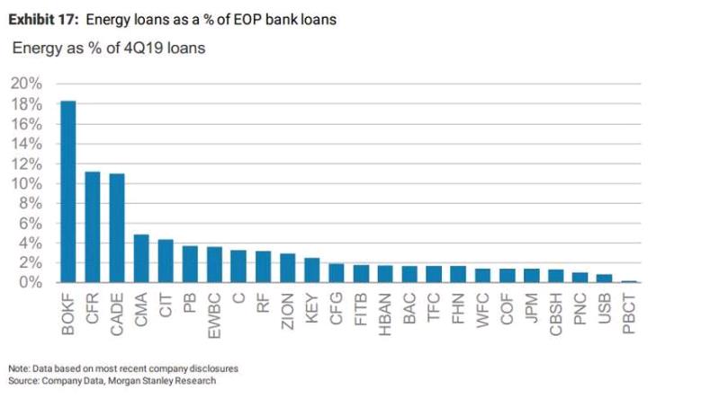 摩根士丹利在本周的一份報(bào)告中列舉了上一年四季度中,美國對(duì)能源行業(yè)敞口最高的銀行,如下圖: