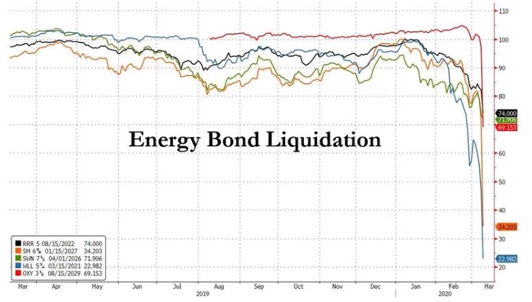 沙特、俄羅斯突然之間不能在產(chǎn)量方面好好商談,美國頁巖油莫明被cue。但頁巖油并不孤單,跟隨它一起受難的還有美國的銀行業(yè)、鋼