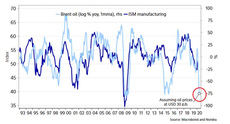 北歐銀行的Martin Enlund 研究發(fā)現(xiàn),美國資本支出與國際油價(jià)有相關(guān)性很高,而現(xiàn)在美國的資本支出已經(jīng)隨著油價(jià)大幅下滑。