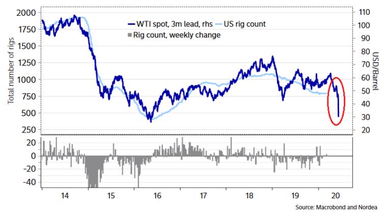 資本市場對(duì)于沙特和俄羅斯重新達(dá)成協(xié)議的期望值已經(jīng)降至最低,認(rèn)為這是一場曠日持久的市場份額爭奪戰(zhàn)。因此,原油價(jià)格可能在現(xiàn)在的基礎(chǔ)上再下跌10%或更多。這可能對(duì)美國石油行業(yè)造成巨大的身體打擊,資金緊張的公司將面臨更大幅度的削減,甚至破產(chǎn)和被迫合并。