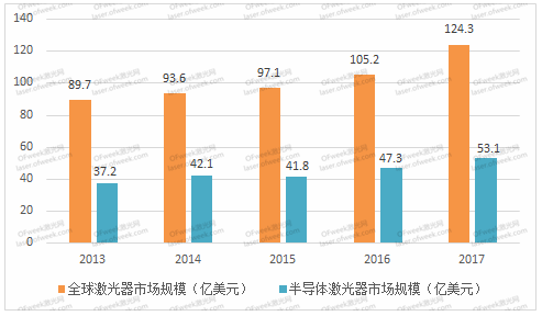 有數(shù)據(jù)統(tǒng)計,對全球激光器市場而言,半導(dǎo)體激光器則占據(jù)了主導(dǎo)地位(約占43%)。全球半導(dǎo)體激光器市場規(guī)模從2012年的35.4億美元增加至2017年的53.1億美元,年復(fù)合增長率為8.4%。