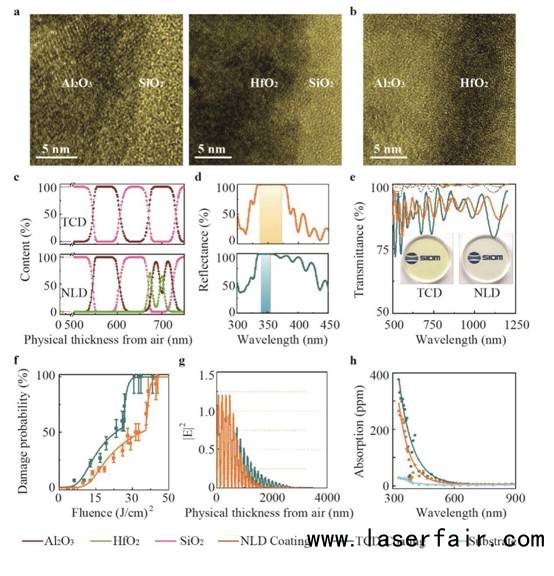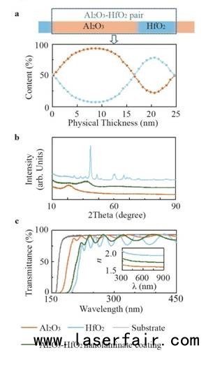 在這項(xiàng)工作中,研究團(tuán)隊(duì)展示了一種基于共蒸界面納米疊層的“集高反射率和高激光損傷閾值于一體”的反射薄膜設(shè)計(jì)方法。在這種設(shè)計(jì)方法中,采用兩種材料交替的納米疊層作為一層具有高折射率和大光學(xué)帶隙的等效層,取代傳統(tǒng)組合膜系設(shè)計(jì)中的高折射率膜層。在保持總光學(xué)厚度不變的前提下,通過改變納米疊層中兩種材料的厚度比例,可以調(diào)節(jié)納米疊層薄膜的(平均)折射率和光學(xué)帶隙。這使得發(fā)展出同時(shí)具備高反射率和高激光損傷閾值的紫外反射薄膜成為可能。隨后,研究團(tuán)隊(duì)使用電子束沉積技術(shù),在實(shí)驗(yàn)上證明了基于Al2O3-HfO2納米疊層的反射薄膜在紫外波段具有更高的反射率、帶寬和激光損傷閾值,適用于紫外激光領(lǐng)域。與傳統(tǒng)組合膜系設(shè)計(jì)相比,該納米疊層設(shè)計(jì)的紫外激光反射薄膜(兩者總膜層厚度接近)具有若干優(yōu)點(diǎn)。首先,納米疊層設(shè)計(jì)薄膜在紫外波段具有更高的反射率和更寬的帶寬,同時(shí)在可見至近紅外波段具有更低的透射波紋;其次,納米疊層設(shè)計(jì)薄膜中電場(chǎng)強(qiáng)度隨膜層深度衰減的更快,節(jié)瘤缺陷引起的電場(chǎng)增強(qiáng)更低,薄膜中的吸收更低,從而具有更高的紫外激光損傷閾值;最后,該技術(shù)適用于大尺寸(對(duì)角線尺寸達(dá)米級(jí))激光薄膜的制備。研究團(tuán)隊(duì)利用納米疊層的折射率和光學(xué)帶隙可調(diào)諧的特性來設(shè)計(jì)超越傳統(tǒng)紫外激光薄膜性能的新型紫外激光反射薄膜,為提高激光薄膜綜合性能提供了一種重要的技術(shù)途徑?;诩{米疊層的激光薄膜設(shè)計(jì)思想在未來可以通過改變疊層材料種類和厚度比例進(jìn)一步拓展從而形成其他高綜合性能的激光薄膜元件。據(jù)悉,本論文的核心概念已提交了中國(guó)發(fā)明專利申請(qǐng)。