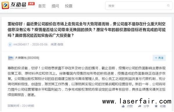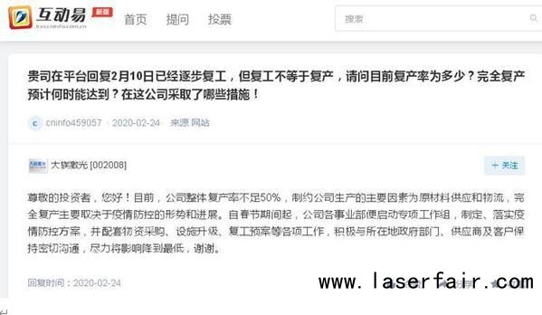 至于何時(shí)能完全復(fù)工復(fù)產(chǎn),大族激光激光則表示完全復(fù)產(chǎn)主要取決于疫情防控的形勢(shì)和進(jìn)展。
