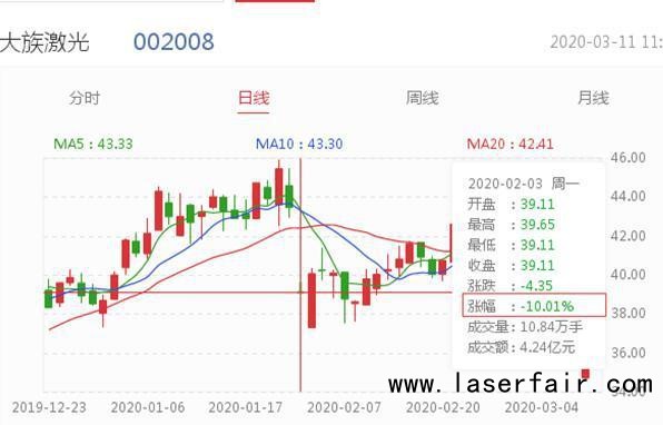 深交所數(shù)據(jù)顯示,今年以來,大族激光在四個(gè)交易里日跌幅超5%,分別為3月9日,收盤價(jià)35.62元/股,漲跌幅為-6.51%;2月28日,收盤價(jià)為38.09元/股,漲跌幅為-5.58%;2月26日,收盤價(jià)為40.75元/股,漲跌幅為-6.32%;2月3日,收盤價(jià)為39.11元/股,漲跌幅為-10.01%。顯而易見,其中最高日跌幅超10%。