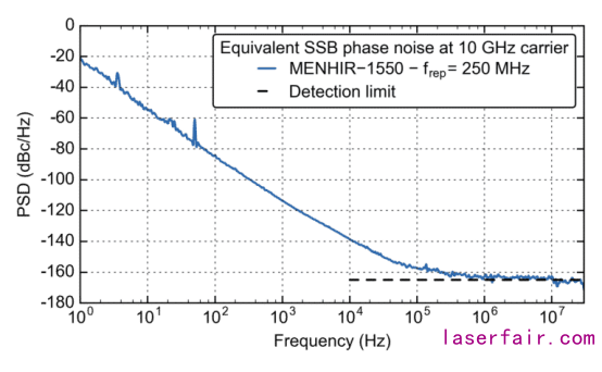 Fig 1.:(上) 在10GHz諧波上測量250MHz重頻的MENHIR-1550激光器的位相噪聲功率譜;