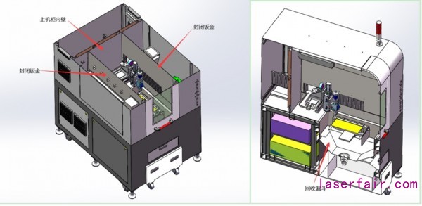 (1)封閉鈑金、防塵罩、防塵罩封閉鈑金與機(jī)柜形成一個(gè)封閉的切割區(qū)域,將切割時(shí)產(chǎn)生的貴金屬粉末留在切割區(qū)域,便于回收貴金屬粉末。