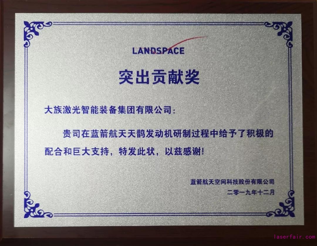大族激光智能裝備集團(tuán)榮獲藍(lán)箭航天頒發(fā)的“2019創(chuàng)新獎”、“突出貢獻(xiàn)獎”。高功率激光焊接銷售總部總經(jīng)理王祥出席接受頒獎,并作發(fā)言。