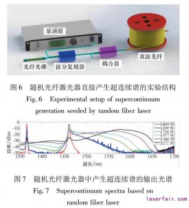 隨機光纖激光器是一種新型的光纖激光器,可利用光纖中的瑞利散射提供隨機分布反饋,從而代替?zhèn)鹘y(tǒng)激光器的諧振腔結構,還可以利用被動光纖中的受激拉曼散射提供增益,具有結構簡單、時域穩(wěn)定等優(yōu)點。2010年,英國阿斯頓大學 Turitsyn 等運用了一種開腔結構的隨機激光器,利用光纖中的瑞利散射和拉曼效應實現激光反饋和增益放大,首次提出隨機分布反饋光纖激光器概念。近年來,隨機光纖激光器發(fā)展迅速,在理論和實驗研究上均取得了較大進展,在大功率光纖激光器研制方面,隨機光纖激光器的輸出功率已突破 3000 W。當前,利用隨機光纖激光器產生超連續(xù)譜的研究尚處于起步階段,但該方案作為一種高魯棒性、高性價比的實現方案,具有很大的商業(yè)潛力。2016 年,上海交通大學Tang 等將隨機光纖激光器作為泵浦源,研究了硫化物光纖中超連續(xù)譜的產生。2017 年,電子科技大學 Ma 等首次報道了隨機光纖激光器中直接產生超連續(xù)譜的實驗研究,實驗結構如圖 6所示。隨機光纖激光器采用半開腔結構,中心工作波長為 1365 nm 的拉曼激光器為泵浦源,半開腔中光纖光柵的中心工作波長為1461 nm,被動光纖的長度約為 16 km。當泵浦功率為 3. 177 W 時,得到了 20 dB 寬度為 250 nm 的超連續(xù)譜輸出,結果如圖 7 所示?;谠摲椒ǎn題組還進一步優(yōu)化了實驗結果。