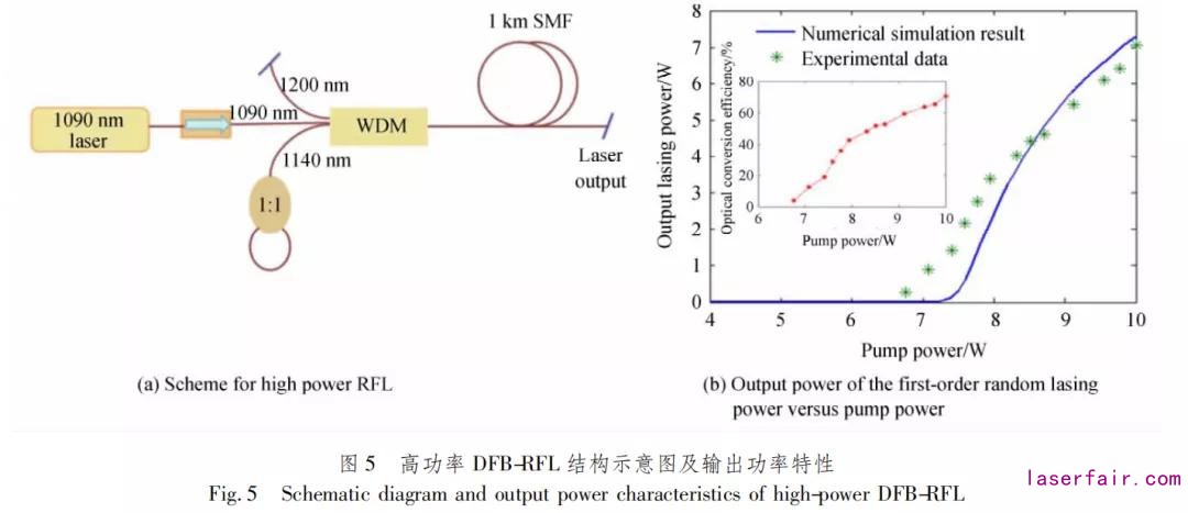 通常,由于單模光纖后向瑞利散射系數(shù)相對較低,所以由較長單模光纖(>40km) 構(gòu)成的 DFB-RFL 的激射效率明顯低于傳統(tǒng)的拉曼光纖激光器。因此,DFB-RFL 的一個重要研究方向就是提高其激射效率。2014年,研究人員在基于短腔高功率、高效率 RFL 的研究上取得重要突破,研究結(jié)果表明,通過采用由一段較短單模光纖和靠近泵浦輸入端的點式反射鏡構(gòu)成的半開腔結(jié)構(gòu),在泵浦端點式反饋鏡和短光纖中的隨機(jī)分布瑞利散射的共同作用下,可以產(chǎn)生高效率、高功率的一階隨機(jī)激光,如圖 5( a) 所示。實驗中采用 10 W 的 1090 nm 泵浦和 1 km 標(biāo)準(zhǔn)單模光纖獲得了較高輸出功率( 7 W) 和較高光轉(zhuǎn)換效率( 70% ) 的隨機(jī)激光,如圖 5( b) 所示。