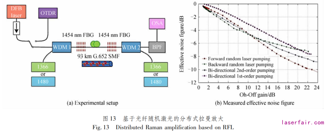 2013 年,基于高階 DFB-RFL 泵浦的 DRA 新概念被提出并得到實驗驗證。由于 DFB-RFL 獨有的半開 放腔結(jié)構(gòu),其反饋機(jī)制僅僅依賴于光纖中隨機(jī)分布的瑞利散射,產(chǎn)生的高階隨機(jī)激光的光譜結(jié)構(gòu)、輸出功率均展現(xiàn)出優(yōu)異的溫度不敏感特性,所以高階 DFB-RFL 能形成一個非常穩(wěn)定的低噪聲全分布式泵浦源。圖 13( a) 所 示實驗驗證了基于高階 DFB-RFL 的分布式拉曼放大概念,圖 13( b) 為不同泵浦功率下,透明傳輸狀態(tài)下的增益分布情況。比較可知,雙向二階泵浦最佳,其增益平坦度為 2. 5 dB,后向二階隨機(jī)激光泵浦次之( 3. 8 dB) ,而前向隨機(jī)激光泵浦與一階雙向泵浦接近,分別為 5. 5 dB 及 4. 9 dB,后向 DFB-RFL 泵浦的表現(xiàn)為較低的平均增益和增益波動。同時,該實驗中前向 DFB-RFL 泵浦在透明傳輸窗口的有效噪聲系數(shù)比雙向一階泵浦的低 2. 3 dB, 比雙向二階泵浦低 1. 3 dB。該方案相比于常規(guī) DRA 在抑制相對強(qiáng)度噪聲轉(zhuǎn)移、實現(xiàn)全程均衡傳輸/傳感等方面綜合優(yōu)勢明顯,且隨機(jī)激光對溫度不敏感,穩(wěn)定性好,因此,基于高階 DFB-RFL 的 DRA 可為長距離光纖傳輸/傳感提供低噪聲、穩(wěn)定的分布式均衡放大,具有實現(xiàn)超長距離無中繼傳輸與傳感的潛力。