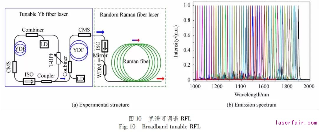 光纖隨機(jī)激光器結(jié)構(gòu)最大的特點是開放腔,不受限于諧振結(jié)構(gòu)及波長選擇器件,因而適用于寬譜發(fā)射、多階級聯(lián)、寬譜可調(diào)諧激光器的研究,近年來這一領(lǐng)域也涌現(xiàn)出一系列優(yōu)秀成果。2016 年,俄羅斯 BABIN S A 等在全保偏光纖結(jié)構(gòu)中實現(xiàn)了三階拉曼隨機(jī)激光,每一階激光波長保持相對窄帶寬的同時,都達(dá)到了約 80% 的轉(zhuǎn)換效率。中國計量大學(xué) DONG X 團(tuán)隊在半開放結(jié)構(gòu)中實現(xiàn)了多波長、可調(diào)諧光纖隨機(jī)激光器輸出。中國科學(xué)院上海光學(xué)精密機(jī)械研究所 FENG Y 團(tuán)隊在寬譜可調(diào)諧隨機(jī)激光發(fā)射方面進(jìn)行了出色的研究,2016 年,采用可調(diào)諧的摻鐿激光器泵浦源以及配合高階拉曼激射,實現(xiàn)了 1 070 ~ 1 370 nm 的寬譜可調(diào)諧發(fā)射。2017 年,為了進(jìn)一步拓寬發(fā)射范圍,他們采用具有更長波長色散零點的拉曼光纖,實現(xiàn)了從 1 ~ 1. 9 μm的超寬譜隨機(jī)激光可調(diào)諧發(fā)射,其實驗結(jié)構(gòu)及發(fā)射光譜如圖 10 所示。2018 年,該團(tuán)隊在產(chǎn)生高階 拉曼隨機(jī)激光的同時,獲得了第九階隨機(jī)激光約 115 W 的高功率輸出,驗證了該結(jié)構(gòu)可以同時實現(xiàn)寬譜可 調(diào)諧和高功率輸出的特性。南京郵電大學(xué)研究了多倍布里淵頻移的多波長布里淵摻鉺光纖激光器,輸出 波長可以在 60 nm 范圍內(nèi)調(diào)諧。