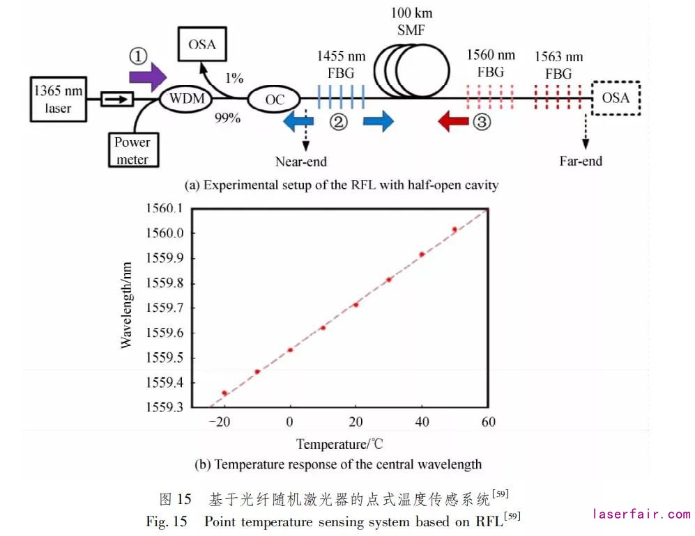 在 2012 年報道的研究工作中,通過一個 DFB-RFL 光源和 FBG 反射,可以在 100 km 長光纖中產(chǎn)生隨機(jī)激光。通過不同的結(jié)構(gòu)設(shè)計,可以分別實現(xiàn)一階和二階激光輸出,如圖 15( a) 所示。對于一階結(jié)構(gòu),泵浦源是 1 365 nm 激光器,與一階斯托克斯光波長( 1 455 nm) 匹配的 FBG 傳感器放在光纖另外一端。二階結(jié)構(gòu)包含一個 1 455 nm 點式 FBG 反射鏡,反射鏡放在泵浦端使之更容易產(chǎn)生激射,而 1 560 nm FBG 傳感器放置在光纖遠(yuǎn)端。產(chǎn)生的激射光在泵浦端輸出,通過測量出射光的波長變化量就可以實現(xiàn)溫度傳感。激射波長隨 FBG 溫度變化的典型關(guān)系如圖 15( b) 所示。