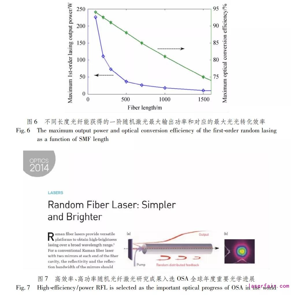 進(jìn)一步理論計算表明,采用更短的光纖時,最大的光光轉(zhuǎn)化效率會更高,二階隨機(jī)激光的閾值也會更高( 圖 6) ,獲得的一階隨機(jī)激光的最大輸出功率會隨光纖長度的降低而迅速增大,如采用 100 m 光纖時,在 240 W泵浦作用下,有望得到 226 W 的一階隨機(jī)激光輸出,光光轉(zhuǎn)化效率為 94% ,逼近量子極限 95%。國防科技大學(xué)利用強(qiáng)泵浦,用摻鐿光纖激光器泵浦 120 m 長無源光纖和 FBG 構(gòu)成的半開腔 DFB-RFL,將隨機(jī)光纖激光功率輸出記錄提高到了 193. 5 W( 泵浦功率 221. 4 W) ,光光轉(zhuǎn)化效率約為 89% ,這一實驗結(jié)果與 2014 年電子科技大學(xué)的理論預(yù)測吻合得很好。俄羅斯課題組 VATNIK I D 等論證了在高于閾值時光纖隨機(jī)激光的光光轉(zhuǎn)換效率接近 100%。上述研究成果表明: 短腔 DFB-RFL 具有結(jié)構(gòu)簡單、性能穩(wěn)定、可靠性高、壽命長等顯著優(yōu)點,可望實現(xiàn)比傳統(tǒng)拉曼光纖激光器更高的輸出效率和功率,從而為高功率光纖激光器的發(fā)展提供新的發(fā)展思路,被美國光學(xué)學(xué)會( Optical Society of America,OSA) 會刊 Optics & Photonics News 評為 2014 年度全球 30 項重要光學(xué)進(jìn)展之一: “Random fiber laser: Simpler and Brighter”( 圖 7) ??梢云诖?,高功 率隨機(jī)光纖激光器有望在激光加工、激光武器、光學(xué)成像、光學(xué)測量等領(lǐng)域獲得重要應(yīng)用。