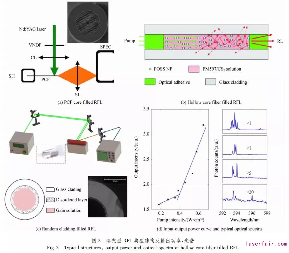 根據(jù)反饋類型分類,光纖隨機(jī)激光器可以主要分為基于瑞利散射分布反饋的光纖隨機(jī)激光器、填充型光纖隨機(jī)激光器和基于隨機(jī)光柵的光纖隨機(jī)激光器三大類別。根據(jù)增益類型分類,光纖隨機(jī)激光器則可以主要分為基于非線性增益( 如拉曼增益和布里淵增益) 的光纖隨機(jī)激光器基于稀土摻雜離子增益的光纖隨機(jī)激光器及基于混合增益的光纖隨機(jī)激光器。其中瑞利散射型和隨機(jī)光柵型光纖隨機(jī)激光器均為實心光纖中實現(xiàn),其發(fā)展歷程也從最早的采用通信用標(biāo)準(zhǔn)單模光纖逐漸拓展到各種特種光纖,從早期的光譜特性、結(jié)構(gòu)探索的研究逐漸拓展到新機(jī)理、新現(xiàn)象的解釋,在發(fā)掘光纖隨機(jī)激光研究潛力的同時,也催生出了許多極具特色的研究方向。