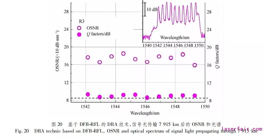 2016 年,TAN M 等將圖 18 所示的基于 DFB-RFL 的 DRA 技術(shù)應(yīng)用于 10 × 116 Gb /s DP-QPSK WDM 中,并比較了該方案與基于傳統(tǒng)拉曼激光器( 光纖兩端均放置 1 455 nm FBG) 的 DRA 方案以及傳統(tǒng)二階拉曼放大方案( 光纖一端同時注入 1 365 nm 和 1 455 nm 泵浦) 的傳輸性能。結(jié)果表明,采用 DFB-RFL 的 DRA 技術(shù)能獲得最長的傳輸距離,達(dá)到 7 915 km。圖 20 為采用 DFB-RFL 的 DRA 技術(shù),信號光傳輸7 915 km 后的光學(xué)信噪比( Optical Signal to Noise Ratio,OSNR) 和光譜圖,可以看出各信道間的 OSNR 波動較小,且均 在 Q 值閾值之上。以上實驗結(jié)果均表明,基于 DFB-RFL 的 DRA 技術(shù)在超長距離無中繼光傳輸中具有較大的潛力和優(yōu)勢。