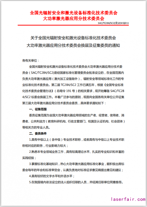 關(guān)于全國光輻射安全和激光設(shè)備標準化技術(shù)委員會大功率激光器應(yīng)用分技術(shù)委員會換屆及征集委員的通知