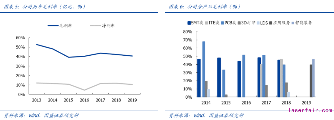 目前公司主要的收入和盈利來(lái)自于應(yīng)用服務(wù)業(yè)務(wù),尤其是傳統(tǒng)SMT業(yè)務(wù)以及PCB業(yè)務(wù),毛利率長(zhǎng)期保持在40%以上。雖然2018年及2019年P(guān)CB業(yè)務(wù)因手機(jī)換代周期延長(zhǎng)以及行業(yè)內(nèi)對(duì)5G、柔性屏等新產(chǎn)品預(yù)期而放緩現(xiàn)有產(chǎn)品的生產(chǎn),導(dǎo)致公司PCB類(lèi)業(yè)務(wù)出現(xiàn)下降,但公司整體業(yè)績(jī)還是保持平穩(wěn)增長(zhǎng);SMT類(lèi)依舊保持穩(wěn)定增長(zhǎng);3DP應(yīng)用服務(wù)類(lèi)經(jīng)過(guò)前期的市場(chǎng)積累,其中的金屬打印類(lèi)業(yè)務(wù)已基本實(shí)現(xiàn)盈虧平衡,醫(yī)療類(lèi)應(yīng)用也逐步找到市場(chǎng)方向。