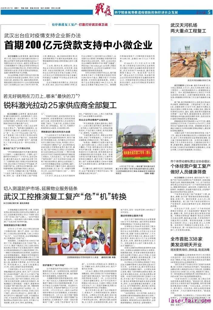 “我們的產(chǎn)品斷供,大批工業(yè)企業(yè)將無(wú)法正常生產(chǎn)?!变J科激光副董事長(zhǎng)、總工程師閆大鵬介紹,這就要求企業(yè)全力以“復(fù)”。但是,3月下旬企業(yè)復(fù)工復(fù)產(chǎn)后,由于批復(fù)復(fù)工的人員較少及供應(yīng)商均未復(fù)工,導(dǎo)致企業(yè)產(chǎn)能不足。經(jīng)政府部門(mén)協(xié)調(diào),相關(guān)企業(yè)積極“逆行”,銳科激光上下游25家企業(yè)在一周內(nèi)全部復(fù)工復(fù)產(chǎn)。
