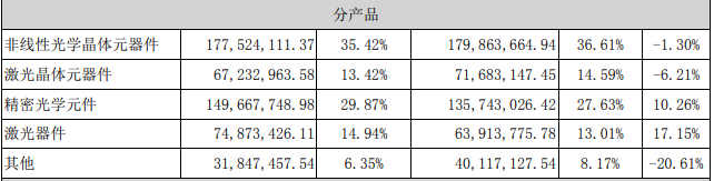分產(chǎn)品來看,非線性光學(xué)晶體元器件營收約1.77億元,同比下降1.30%,占總營收35.42%;激光晶體元器件營收約6723.3萬元,同比下降6.21%;精密光學(xué)元件營收約1.5億元,同比增長10.26%;,占總營收29.87%;激光器件營收7487.3萬元,同比17.15%,占總營收14.94%;其他收入3184.7萬元,同比下降20.61%,占總營收6.35%。