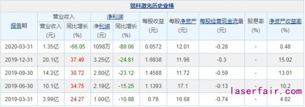 銳科激光一季度凈利潤(rùn)1098萬元 同比下降89%