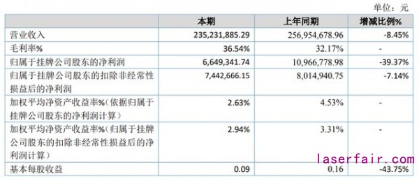 據(jù)了解,報告期內(nèi)天弘激光營業(yè)收入為235,231,885.29元,較上年同期下降8.45%;主要原因為:第一,激光切割機主要為標準化產(chǎn)品,市場競爭激烈,銷售單價低,毛利也相對較低,整體收入較上年同期減少了16.80%;第二,高功率及新能源激光焊接機,主要為非標應用,未按預期實現(xiàn)批量推廣,較上年同期降低了37.23%;第三,激光微加工系列產(chǎn)品較上年同期增加了67.41%。
