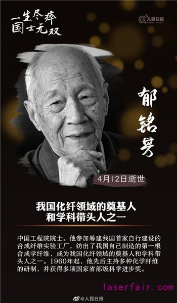 4月12日12時30分,東華大學(xué)材料科學(xué)與工程學(xué)院教授、博士生導(dǎo)師郁銘芳因病醫(yī)治無效逝世,享年93歲。從參與研制并紡出我國第一根合成纖維錦綸6絲,到第一根國產(chǎn)軍用降落傘用錦綸長絲,從組織領(lǐng)導(dǎo)聚酰亞胺纖維、碳纖維、芳綸等高性能纖維研制,到主持“丙綸噴絲直接成布”項目等,60多年來,郁銘芳用一個個的研究成果為解決國人穿衣問題和國防戰(zhàn)略做出了卓有成效的貢獻。
