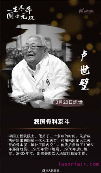 3月28日,中國工程院院士,中國人民解放軍總醫(yī)院主任醫(yī)師、教授盧世璧,因病在北京去世。1996年他當(dāng)選中國工程院院士。2008年被評為一代名師。他先后參與了1966年邢臺地震、1975年營口地震、1976年唐山地震、2008年汶川地震等四次大地震的救援工作,是全國抗震救災(zāi)優(yōu)秀共產(chǎn)黨員、全國抗震救災(zāi)模范。