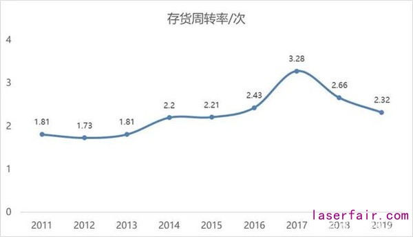 存貨25.32億,較2018年末下降12.8%,不過公司存貨周轉(zhuǎn)率繼續(xù)下降,2019年為2.32次,較2018年下降了0.34次。2017年是轉(zhuǎn)折點,2017年前,存貨周轉(zhuǎn)率保持穩(wěn)定向上增長,2017年達到3.28次后,轉(zhuǎn)頭下降。