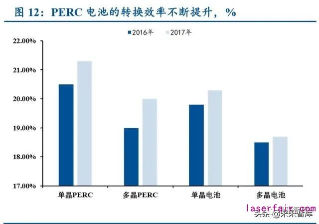 常規(guī)電池轉(zhuǎn)換效率瓶頸凸顯,PERC 電池量產(chǎn)被再度提上日程。盡管上世紀(jì)八十年代,PERC 電池早已在實(shí)驗(yàn)室完成研發(fā),但在隨后的二十年里,PERC 電池產(chǎn)業(yè)化進(jìn)程卻一直處于停滯狀態(tài)。但隨著常規(guī)的鋁背場(chǎng)電池的轉(zhuǎn)換效率逐步逼近 20%的效率天花板,傳統(tǒng)的工藝改良已經(jīng)無(wú)法 滿足日益提升的效率需求。如果要進(jìn)一步突破 20%的效率瓶頸,則需要采用更為先進(jìn)的電池 技術(shù)??紤]到 PERC 技術(shù)對(duì)電池轉(zhuǎn)換效率提升明顯,工藝簡(jiǎn)單,成本低廉,且與當(dāng)時(shí)電池生 產(chǎn)線高度兼容,因此,PERC 電池的量產(chǎn)被再度提上日程。