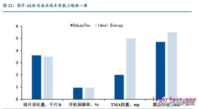ALD 設(shè)備雖然市場(chǎng)份額有限,但或是未來(lái)降本提效的方向所在。盡管 PECVD 設(shè)備長(zhǎng)期占據(jù) 市場(chǎng)的主流地位,但 ALD 設(shè)備的優(yōu)勢(shì)也同樣明顯:1)每小時(shí)的硅片吞吐量高于 PECVD,電池 攤銷的單位固定成本更低;2)可以精控薄膜厚度,成膜質(zhì)量更好;3)前驅(qū)體材料 TMA 消耗更 少,可減少運(yùn)營(yíng)成本。因此,在優(yōu)化 PERC 電池效率,壓縮前運(yùn)營(yíng)成本的背景,ALD 設(shè)備有望成 為新一代的背鈍化設(shè)備,搶占更多市場(chǎng)份額。