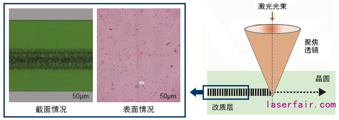 激光隱形切割作為激光切割晶圓的一種方案,很好的避免了砂輪劃片存在的問題。如圖1所示,激光隱形切割是通過將脈沖激光的單個(gè)脈沖通過光學(xué)整形,讓其透過材料表面在材料內(nèi)部聚焦,在焦點(diǎn)區(qū)域能量密度較高,形成多光子吸收非線性吸收效應(yīng),使得材料改性形成裂紋。每一個(gè)激光脈沖等距作用,形成等距的損傷即可在材料內(nèi)部形成一個(gè)改質(zhì)層。在改質(zhì)層位置材料的分子鍵被破壞,材料的連接變的脆弱而易于分開。切割完成后通過拉伸承載膜的方式,將產(chǎn)品充分分開,并使得芯片與芯片之間產(chǎn)生間隙。這樣的加工方式避免了機(jī)械的直接接觸和純水的沖洗造成的破壞。目前激光隱形切割技術(shù)可應(yīng)用于藍(lán)寶石/玻璃/硅以及多種化合物半導(dǎo)體晶圓。