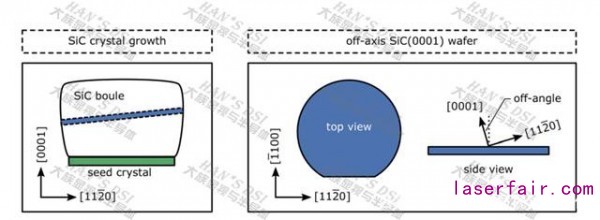 由于碳化硅自然界中擁有多態(tài)(Polymorphs),例如3C-SiC,4H-SiC,6H-SiC等,其中六方晶系的碳化硅理論上有無數(shù)種多態(tài)可能性。目前行業(yè)內(nèi)選用的碳化硅多態(tài)為4H-SiC。為了獲得想要的低缺陷4H-SiC,SiC晶圓通常需要以4°偏軸在種子晶格上進行晶錠生長。因此,在切割垂直晶圓平邊的方向時,裂紋會與C面軸向[0001]產(chǎn)生4°偏角。使用普通激光切割設(shè)備進行切割時,4°的偏角會使材料裂開變得困難,從而使得最終該方向產(chǎn)生嚴重崩邊(chipping)和切割痕跡蜿蜒(meandering)。