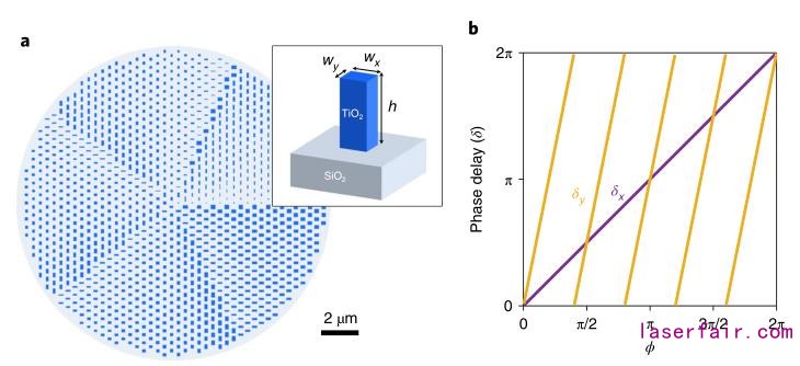 在這項工作中,作者們主要是設(shè)計了一個結(jié)構(gòu)緊湊的超表面手性光激光器。在這個自旋軌道耦合設(shè)備中,最關(guān)鍵的一個器件就是由電介質(zhì)二氧化鈦納米磚構(gòu)成的超表面,如圖3a所示。超表面上每一個納米磚的高度為600納米,其長度和寬帶能夠改變,從而它們可以在可見光532納米波段進行相位調(diào)制,調(diào)制曲線如圖3b所示。