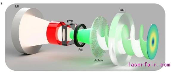 如圖5.所示,是產(chǎn)生高純度渦旋光激光器的示意圖。一個常見的Nd:YAG半導(dǎo)體固體激光器腔,利用非線性KTP晶體實現(xiàn)倍頻轉(zhuǎn)換,輸出532納米的綠光。超表面J-板被放置在綠色諧振腔內(nèi),用來提供一個幾何相位,就這樣一個產(chǎn)生可見光的超表面輔助激光器完成了。其最主要的是利用了超表面J-板,能夠?qū)崿F(xiàn)將SAM和OAM的耦合。