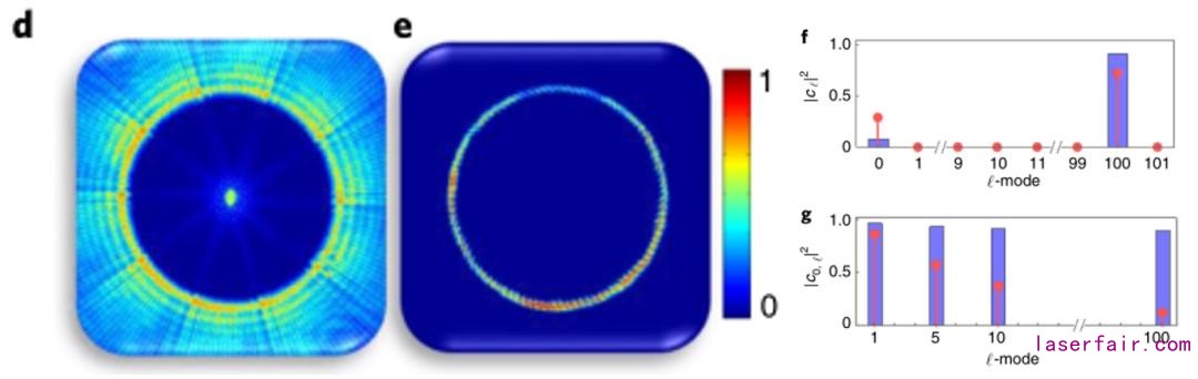 在圖11.中,展示的是超高OAM數(shù)的模式純度。圖11.d表示外部模式,圖11.e表示內(nèi)部模式。從直觀的看,我們也可以發(fā)現(xiàn)內(nèi)部模式明顯優(yōu)于外部模式。在數(shù)據(jù)測量上,對于純度為71%的OAM模式,腔外轉(zhuǎn)化中只有13%的徑向為零,角向為100的純度。而對于腔內(nèi)轉(zhuǎn)化來說,純度高達90%。圖11.f中的數(shù)據(jù)條顯示,紅色棒狀是腔外模式譜,藍色柱狀是腔內(nèi)模式譜,與上面的數(shù)據(jù)說明是一致的。圖11.g表示的在相同的束腰條件下,紅色棒狀顯示的腔外模式轉(zhuǎn)化的純度,藍色顯示本文中提到的諧振腔轉(zhuǎn)化的純度。