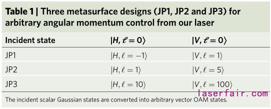 在本文中,作者們制作了三塊超表面J-板,如表1所示。JP1用來實現(xiàn)原先作者們提出的方案(2016年發(fā)表的文章),即實現(xiàn)線性對稱的自旋和軌道耦合轉(zhuǎn)換,但是轉(zhuǎn)換的軌道量子數(shù)只能是正負軌道量子數(shù)的疊加,并且總角動量為零。而JP2和JP3超表面J-板是本文中的重點,它們可以實現(xiàn)任意的兩個正交偏振態(tài)的轉(zhuǎn)換,并且可以生成任意的OAM模式。