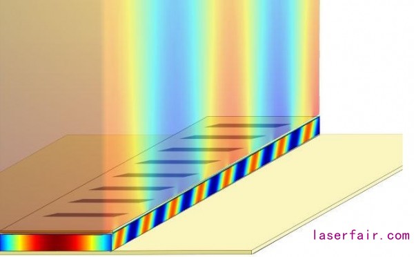 在太赫茲等離子體激光器,使用兩塊金屬薄膜來(lái)封閉激光諧振腔(在上面的一塊金屬薄膜中開(kāi)周期性的狹縫),顏色表示相干SPP光波。其中一個(gè)光波被限制在10微米的波腔內(nèi)。另外一個(gè)光波在空間范圍內(nèi)比較大,位于腔體的頂端。