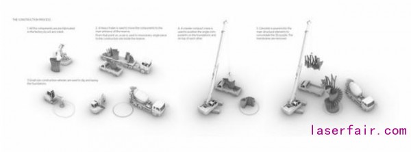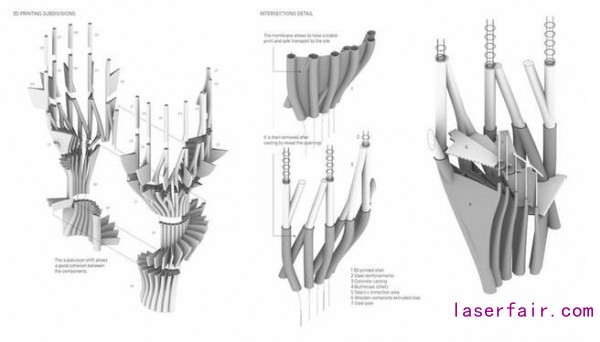 這座觀景臺(tái)被設(shè)計(jì)成多個(gè)2.5米長(zhǎng)的殼體,以2厘米厚的外殼進(jìn)行3D打印,在工廠內(nèi)使用六軸工業(yè)機(jī)器人來(lái)制造。隨后將殼體運(yùn)輸?shù)侥繕?biāo)地點(diǎn),非常精細(xì)和快速地疊放起來(lái)形成中空的完整形狀;最后在立柱中澆筑混凝土從而形成整體的結(jié)構(gòu)。