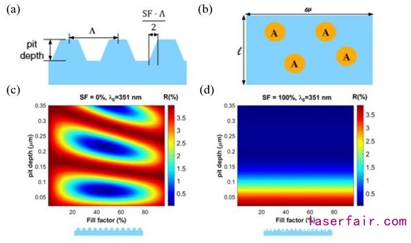 根據(jù)Bruggeman’s聯(lián)合公式,研究人員設(shè)計(jì)了用于多層平面的熔融石英材料結(jié)構(gòu)(見(jiàn)圖1(a)和(b)),通過(guò)填充因子近似表示該層的有效折射率。填充因子指數(shù)將隨基質(zhì)和空隙體積的混合比而變化,變化率取決于特性高度?;谠摷{米幾何結(jié)構(gòu)的傳輸矩陣計(jì)算結(jié)果如圖1(c)和1(d)所示。通過(guò)控制納米結(jié)構(gòu)特征高度和側(cè)壁傾斜度,可以設(shè)計(jì)具有指定特征波段的抗反射結(jié)構(gòu)。